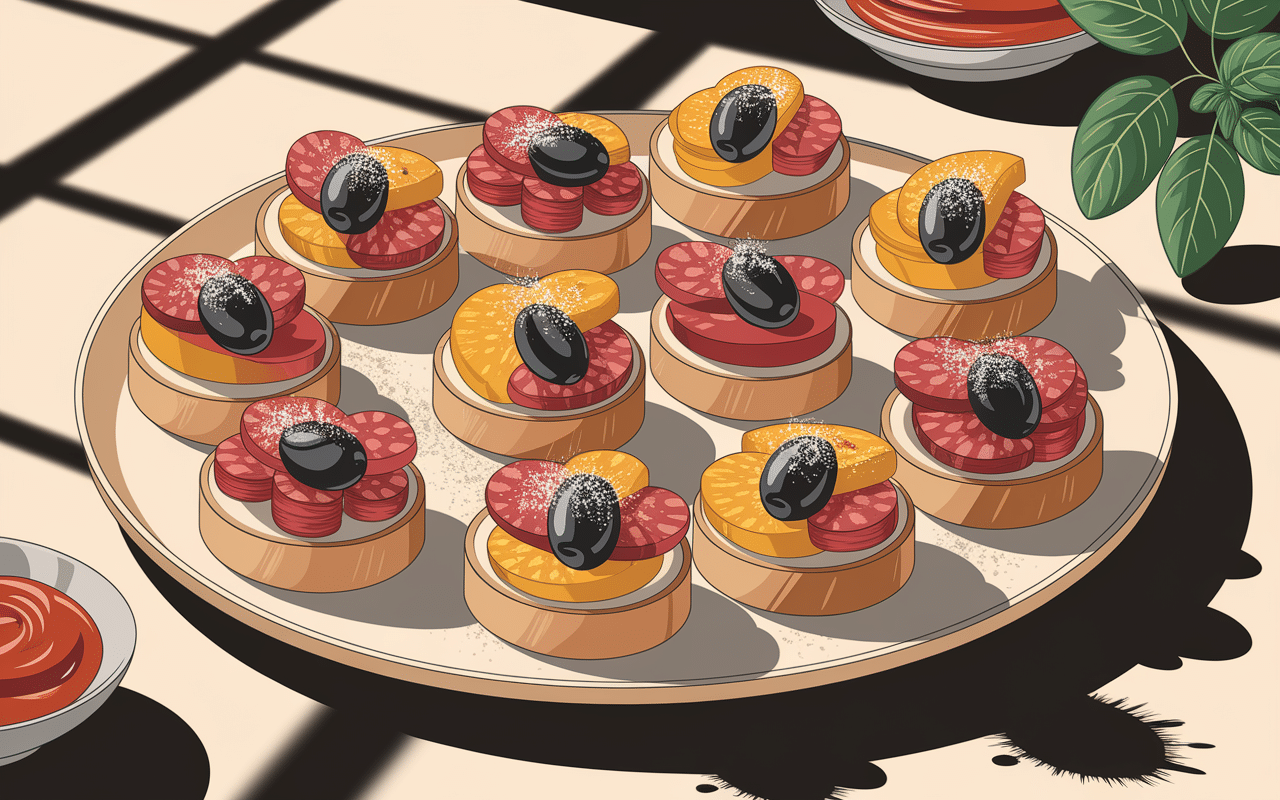 Préparez de savoureuses mini bruschettas à base de sauce tomate, chorizo, poivrons, olives noires et fromage emmental. Ces petites bouchées sont parfaites pour un apéritif ou un en-cas.